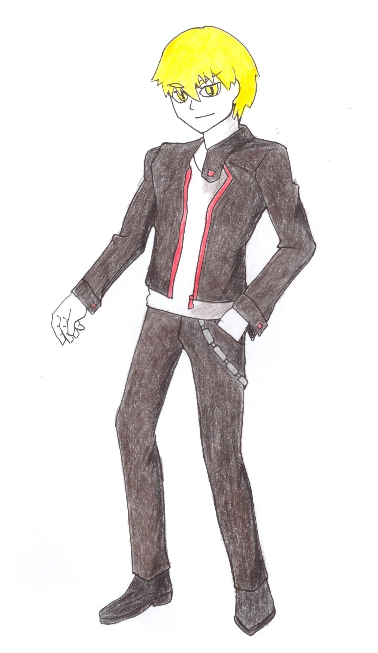 He had blonde hair and golden eyes. he is always seen with a white t-shirt and black pants, jacket and shoes.