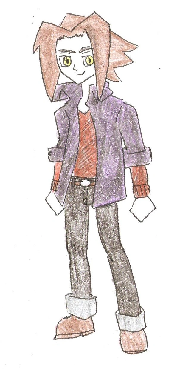 He has neck-length dark brown hair and yellow eyes. He wears a vest and trousers, colored black and violet with an orange trim. On his pants, he wears a brown belt with the symbol of the Royal Knights on its silver buckle. He also dons wrap-up sandals. On his right hand, he has a violet and orange wristband.